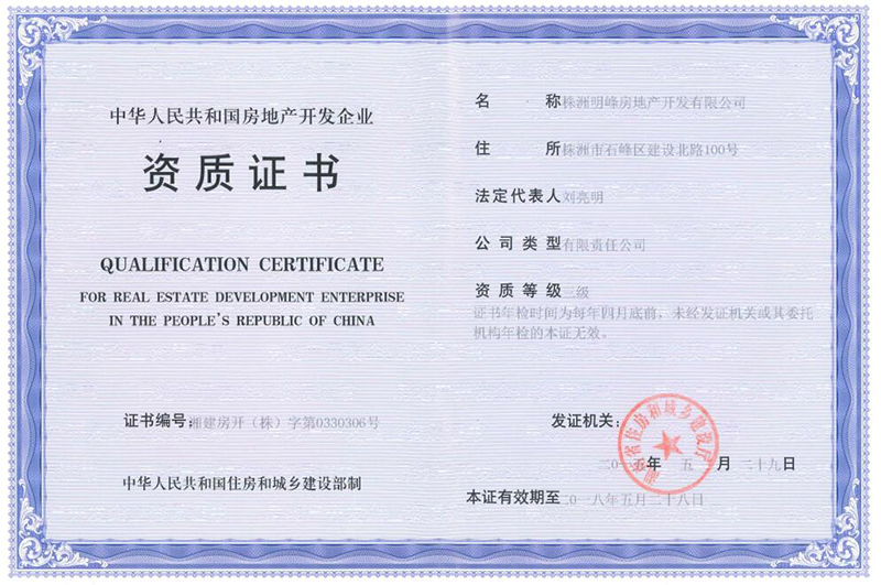 明峰房產(chǎn)三級(jí)房開資質(zhì)